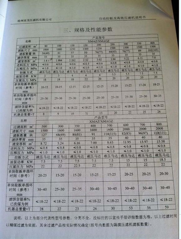 說明:部分代表性 壓濾機(jī) 型號參數(shù),分類不全,沒標(biāo)注的以宣傳手冊詳細(xì)數(shù)據(jù)為準(zhǔn)。以上過濾時間以精煤過濾為依據(jù),其余過濾產(chǎn)品按實際情況確定(括號內(nèi)數(shù)據(jù)為 隔膜壓濾機(jī) 濾板數(shù)量)